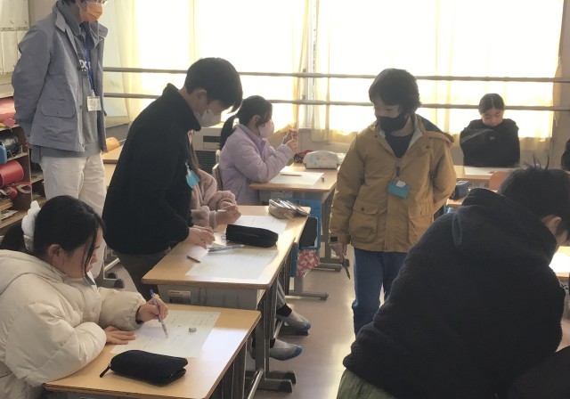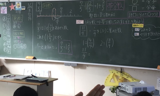 4年1組さん、算数で「帯分数」の勉強をしていました。「仮分数」の4分の11を「帯分数」にするとどうなるかを取り組んでいました。できた子は手を挙げます。先生の〇をもらった子からミニ先生になって、友達をサポートしていました。