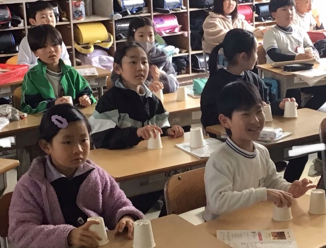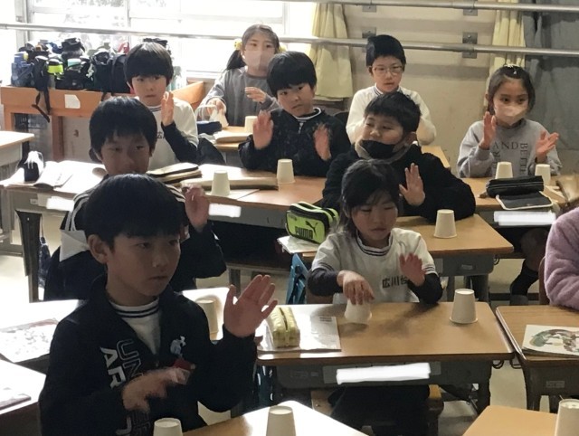 3年1組さん、カップスの動画「夜を駆ける」を見ながら、真似をしてみます。テンポをスローに先生がしてくれる所もありましたが、それでも難しそうです。動画を見ながら手を次々と動かします。