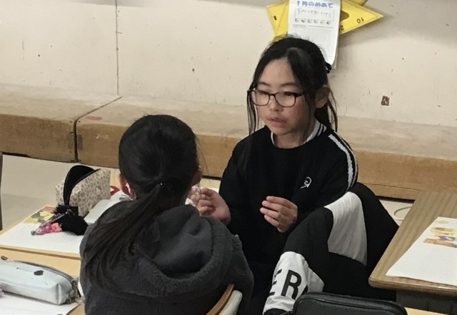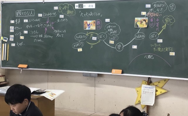 まこさんが「何も言わない」と発言しました。授業の最初では「親切」は「泣いていたら…、言われなくても…、こうけん、ゴミ拾い」だと発言していました。でも主人公のはやとは何もしないんです。でも親切だと言うんです。それがなぜなのか?を友達と話し合っていました。