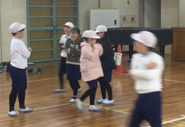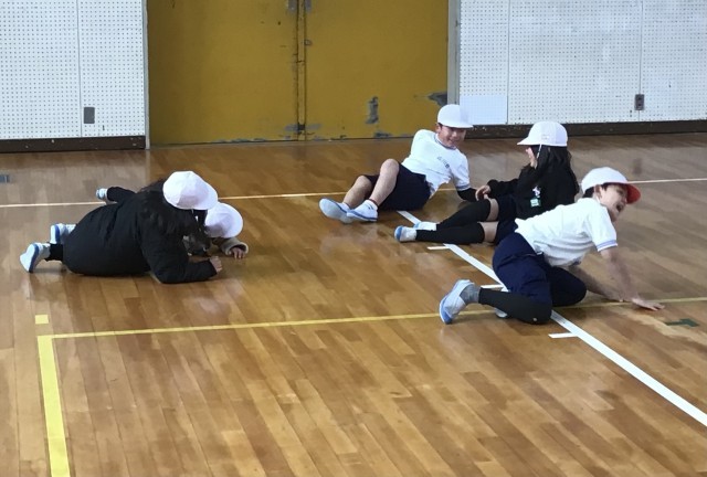 4つのグループに分かれて、先生のお題に沿った表現活動をする2年2組さん。