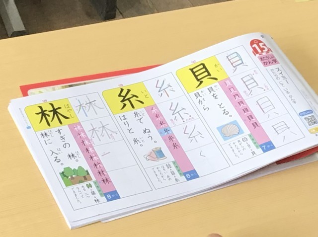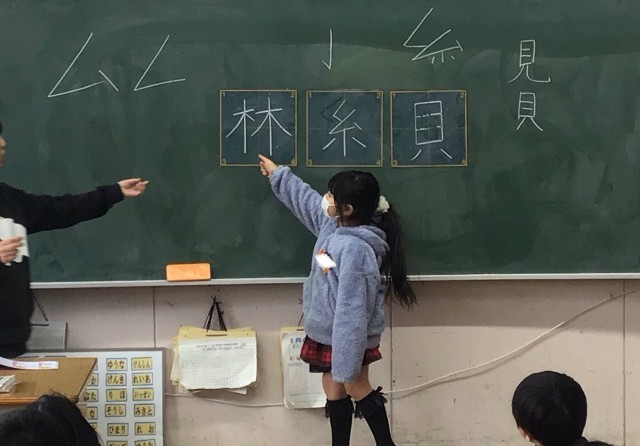 1年1組さん、新出漢字の勉強です。「貝」「糸」「林」を勉強していました。「林の字は、木が2つ並んでいるけれど、右と左で違いがあるのかな?」先生の質問に「前に出て話していいですか?」と指さしながら説明する女の子です。