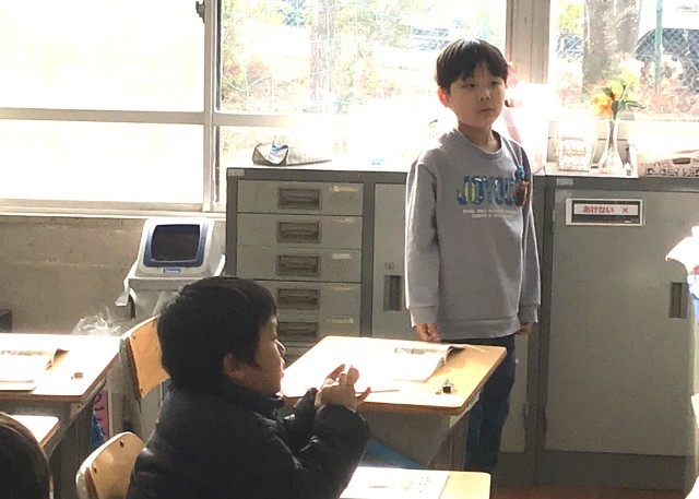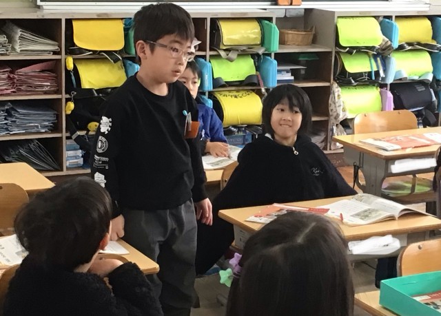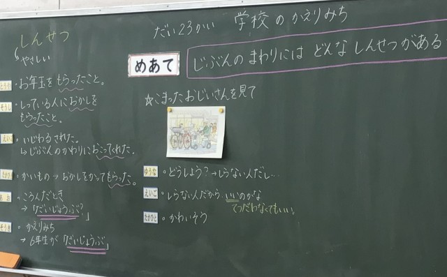 1年2組さん、「学校のかえりみち」というお話で親切について考えていました。スーパーの前で車を動かせなくなっているおじいさん。自転車が道にはみ出ていて、邪魔しています。おじいさんは知っている人ではありません。おばさんが気づいて、自転車をどけ始めます。しかし、自転車はいっぱいです。ゆうじくん、まことくんはおばさんの手伝いを始めます。おばさんは二人を見て、にこにこしています。