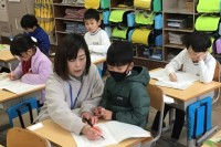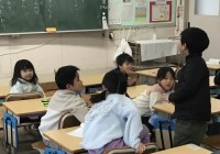 5年2組さん、電磁石の勉強をし、なにやら部品を組み立てて、フットサルロボを作るそうです。先生から機材をもらって、組み立てます。教室をぐるっと1周する形で机が並んでいました。先生は中にいて、悩んでいる子に助言中でした。