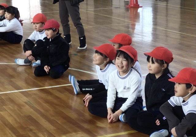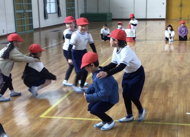 2年1組さん、グループで考えた「表現」の発表です。最初はメリーゴーランドです。一人が馬役、一人がヒト役をして、2人でメリーゴーランドの乗り物を表していました。