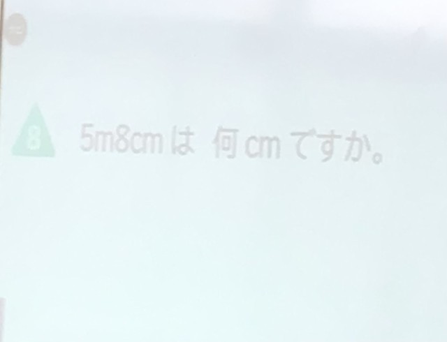 2年2組さん、算数の授業です。今日は5m8cmを「cm」であらわすとどうなるか?の勉強です。答えを見ると、こんな子がいました。