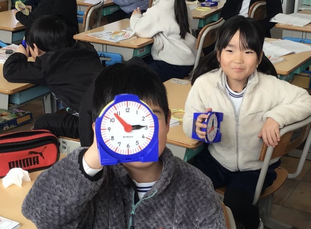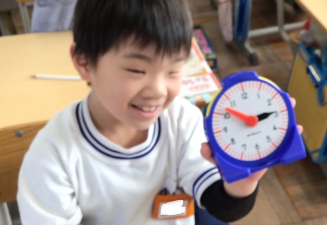 1年1組さん、算数で時計を勉強しました。長い針と短い針を読む練習をして、先生が出してくれる問題に取り組んでいました。