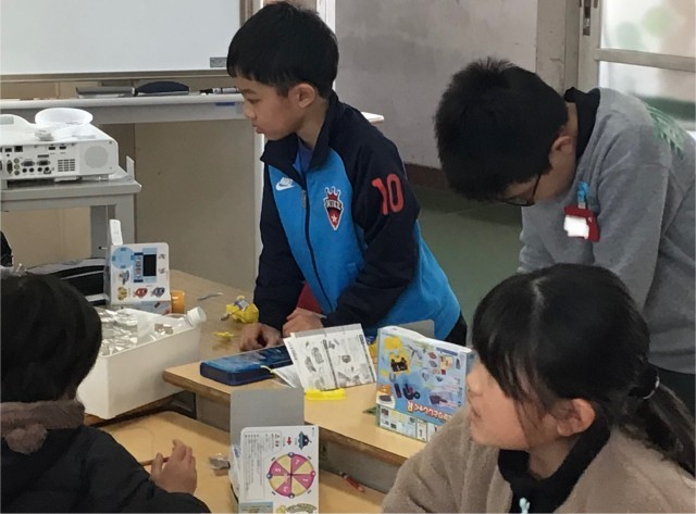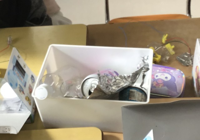 3年2組さん、教室で理科の実験です。電池と導線、豆電球、アタッチメントで回路を作りました。アタッチメントをいろいろなものに繋ぎ、電気が通るかを確認します。机上にはペットボトル、アルミホイル、アルミ缶、スチール缶などが入ったボックスが配られていました。ボックス内の確認ができたら、身の回りの物で確かめてみます。名札についている赤十字のバッチ、安全ピン、椅子の背中部分…。ちなみに、バッチとピンは電気がつきました。椅子はつきませんでした。「何が違うんだろうね?」「おなじような材料なのに…」2組のみんなの頭にはクエスチョンマークがいっぱいでていました。これこそが勉強です。みんなでいっぱい考えてください。