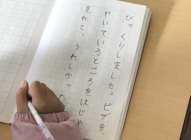 「〇〇さんえ」ではなく「〇〇さんへ」、「〇〇お」ではなく「〇〇を」が正しいですよ…ということを学んだ後、町たんけんで訪れた場所にお礼の手紙を書く練習をしていました。