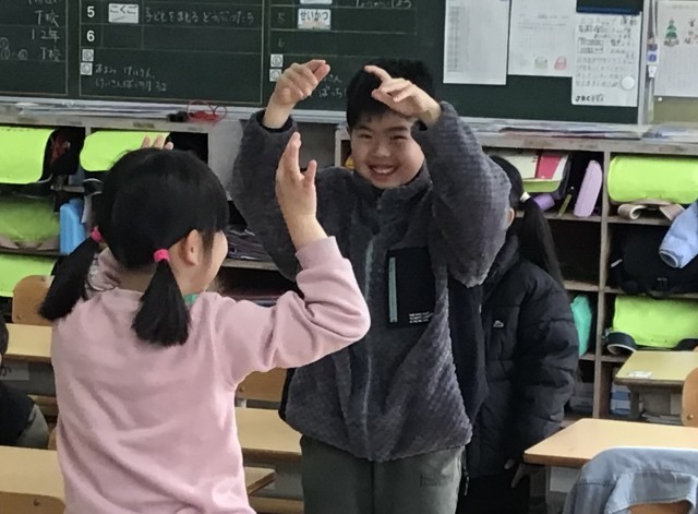 ALTのグレン先生と1年1組のみんなが英語を勉強していました。ダンスを踊ったり、フルーツの名前をリピートしたりしていました。