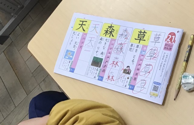 まずは1年2組さん、漢字ドリルを使って「天」という字を勉強中でした。