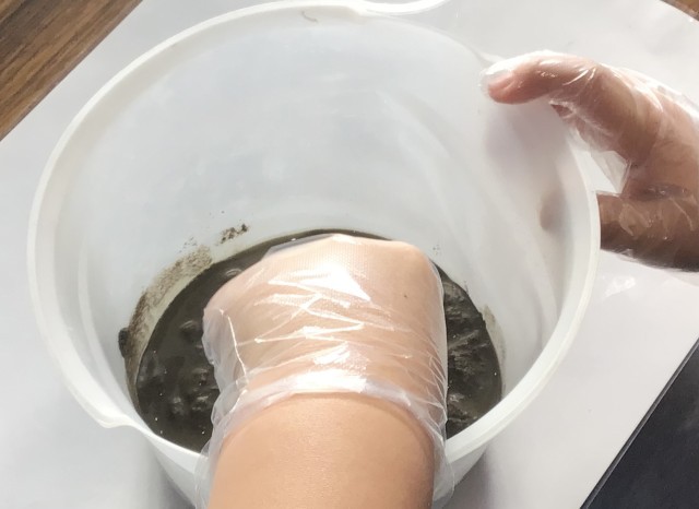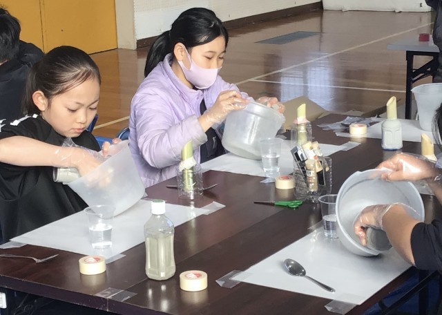 一人ずつ、混ぜる容器も、セメントも、水もカップで準備してくださってます。