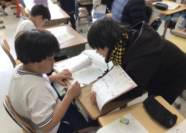 先生から〇をもらった子がミニ先生として、友達にアドバイスを送りに行っていました。