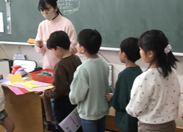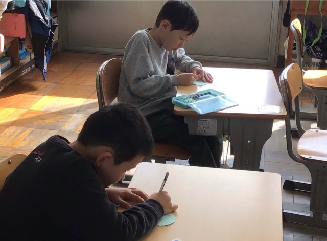 1年生の教室では、6年生のお兄さん、お姉さんに贈るメッセージカードを作っていました。