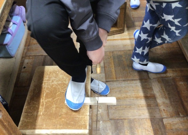 つい先日、「初めてのこぎりを使う!」と話していた1組のみんなですが、今日見ると慣れた感じで木を足で押さえて、のこぎりで切っていました。