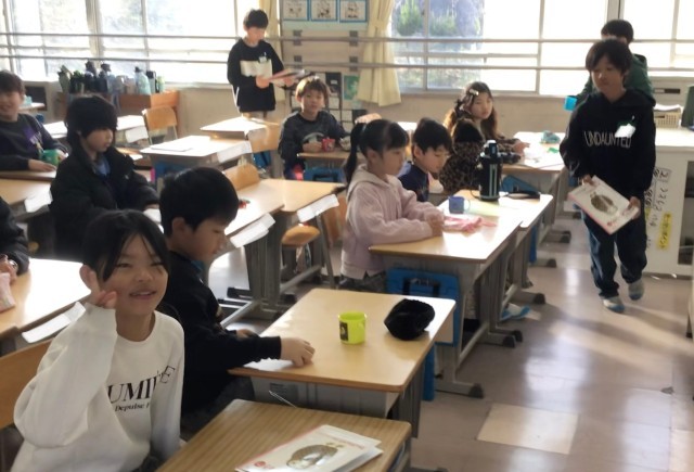 2年2組さん、準備を終えて、先生に配ってもらうのを机の上にコップを置いて待っています。