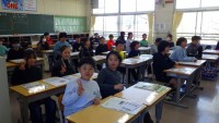 友達に生活科のプリントを見てもらい、嬉しそうに説明をしている男の子です。