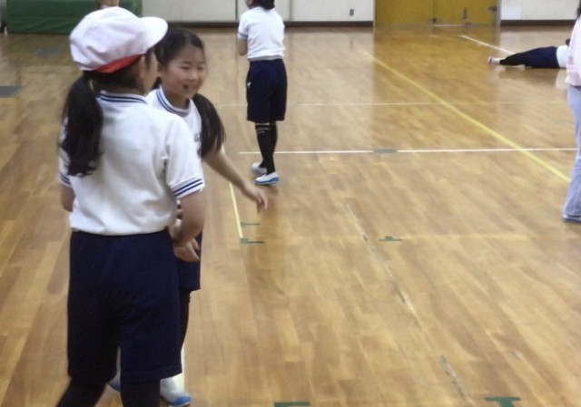 運動場はぬかるんでいるので、3年生の体育は合同で体育館です。