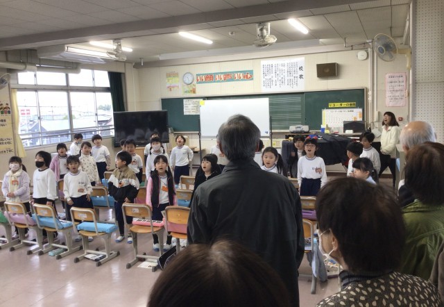 楽器の練習をしていた2組のみんなに、急遽お願いをして、校歌を民生委員のみなさんに披露してもらいました。