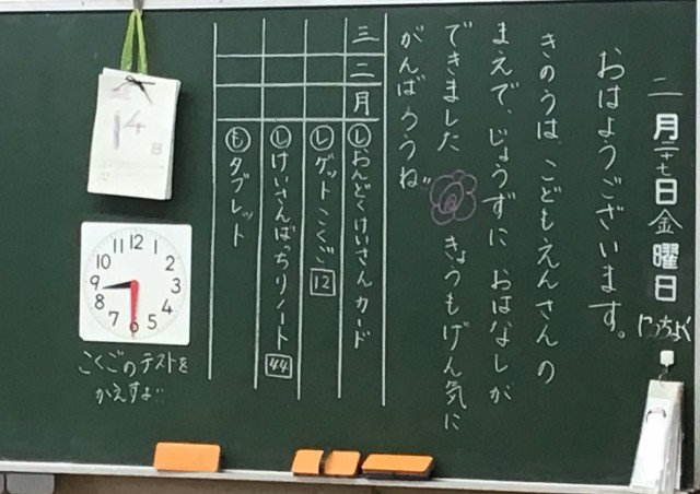 黒板には先生からの頑張ったねメッセージが書かれていました。
