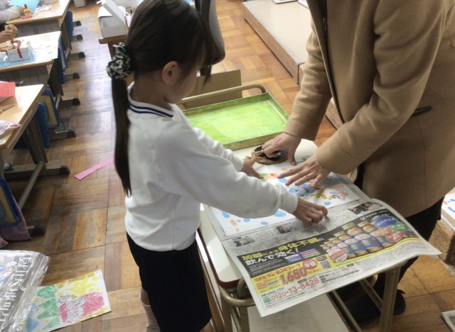 版画を完成させた子は、先生に手伝ってもらって、紙にうつす作業をしていました。