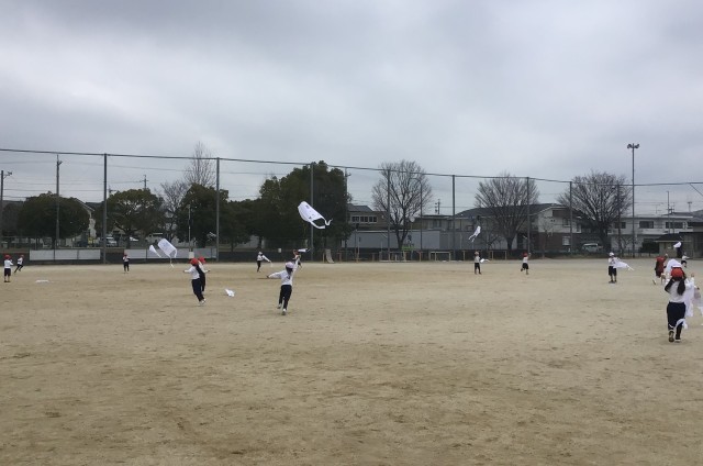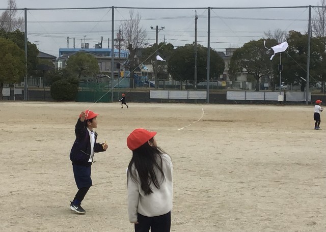 1年生のみんなが3時間目、運動場で凧揚げ大会をしました。