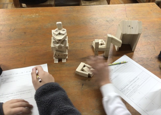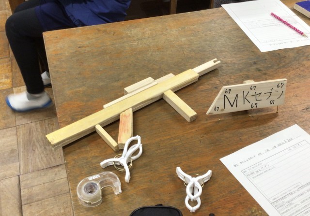 切った木をボンドや釘でくっつけて、おもいおもいの形を作りました。