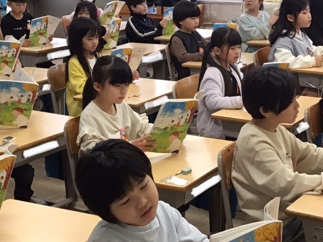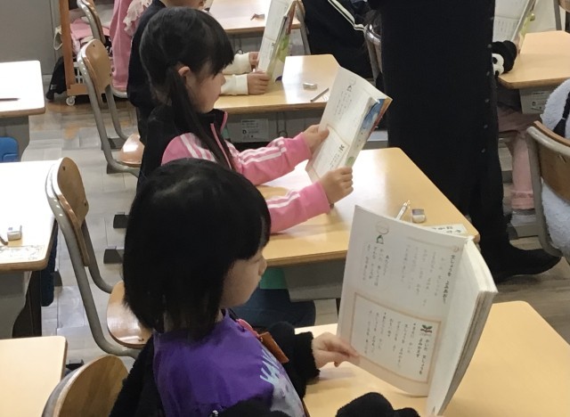 1年2組さん、国語の授業で、先生に続いて音読をしていました。