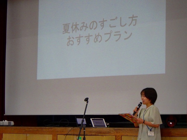 養護教諭の先生が、おすすめの夏休みプランをいくつも考えてくれて、みんな興味深くお話を聴きました。