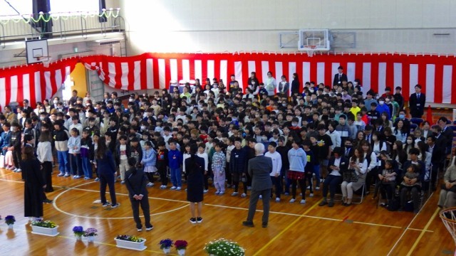 元気よく登校し、教室に入ったのちは体育館へ移動し、始業式、入学式を行いました。