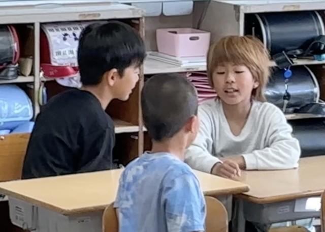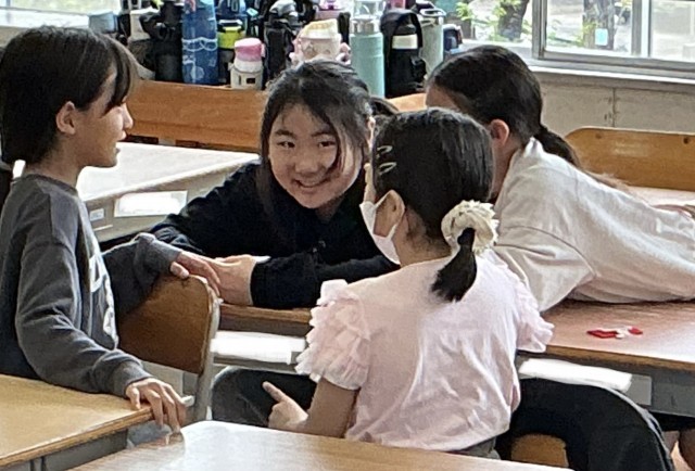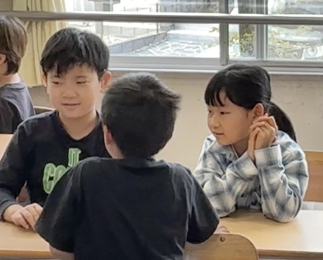 4年2組さんでは席の近い子と「しりとり」をしていました。