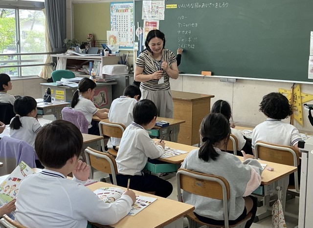 今日はALTの先生と「いろいろな国のあいさつをしよう」ということで、韓国、インド、アメリカなど、いろんな国の「おはよう」を言ってみました。