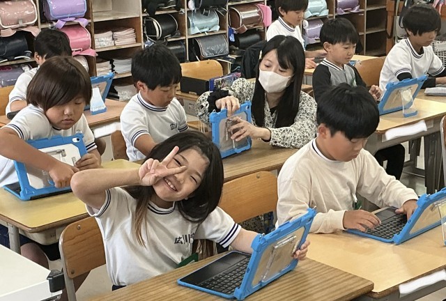 3年2組さんは、6年生の子たちが来る前に、学習用タブレットに社会科の副読本のダウンロードを行っていました。