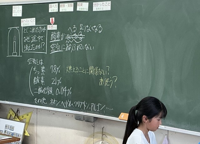 前回の授業で行った実験の結果から「なぜ、とじこめた方が途中で消えたのか?」を調べてみます。