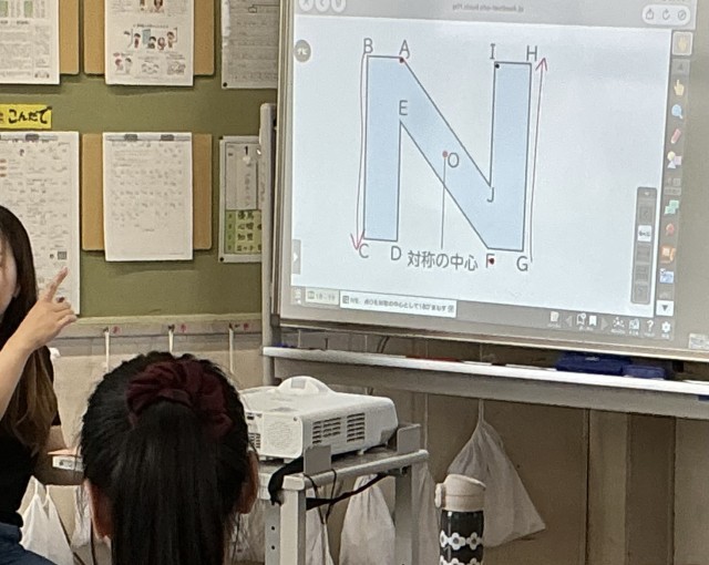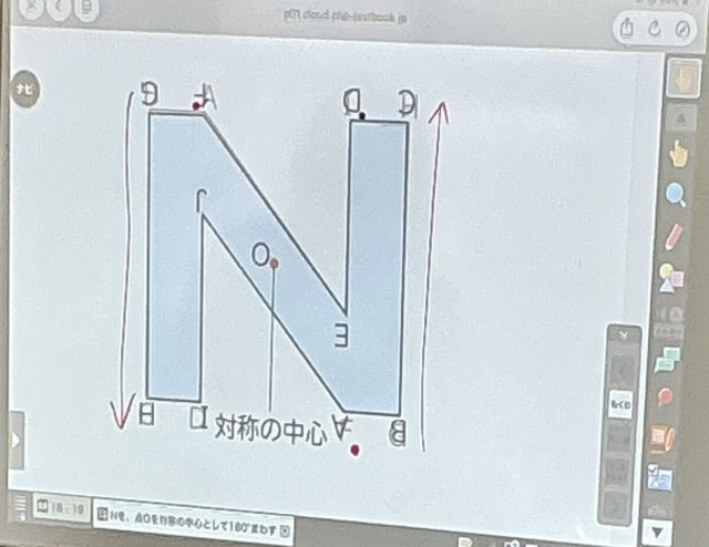先生がスクリーンに映してくれた「N」を画面上で動かしてくれるので、対称かどうかの確認がとても分かりやすかったみたいです。