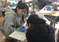 電磁石の勉強で部品を組み立てる5年1組のみんなです。友達と協力しながら説明書...