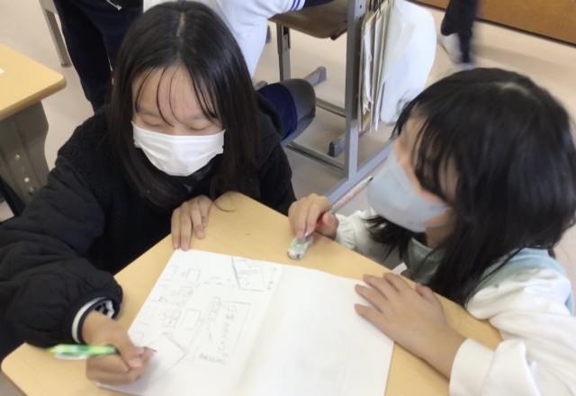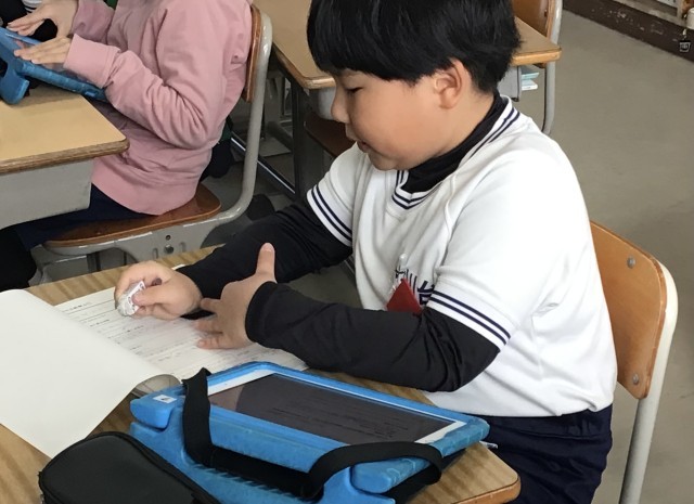 4年2組さん、明日の公開授業で行う「総合的な学習の時間」の発表に向けて、3年生に発表した時をふりかえりながら、グループごとに改良を加えていました。