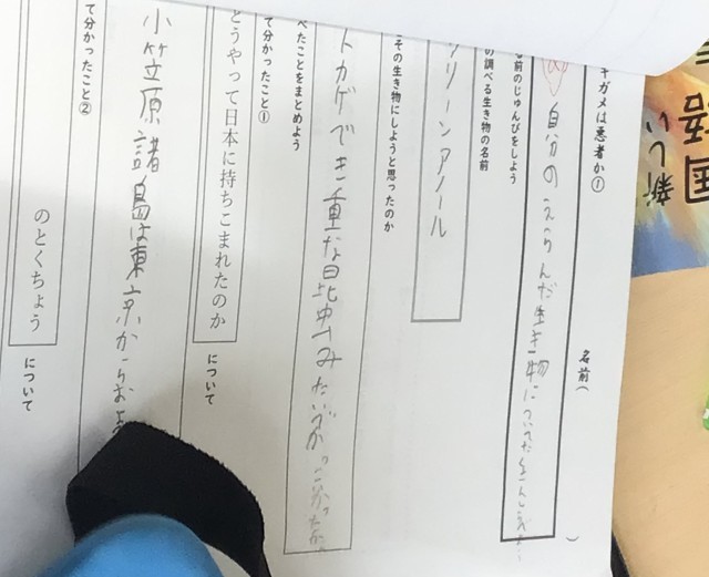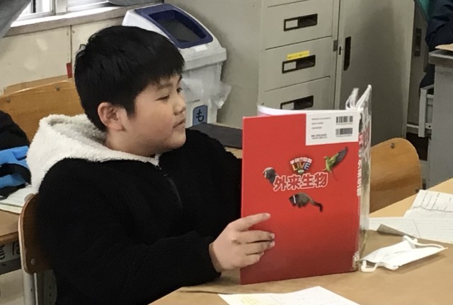 3年1組さん、国語の授業で「自分の選んだ生き物の調べを進めよう」ということで、本やタブレットを使って調べ学習を行っていました。アライグマやリスなど有名な動物を調べている子もいれば、絶滅危惧種や外来生物を調べている子もいて、初めて名前を聞く動物を調べている子もいました。