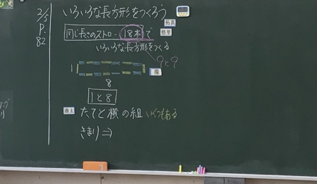 4年1組さん、ストロー18本を使っていろいろな長方形を作ろうという問題を考えていました。