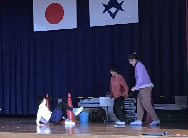 体育館で劇(?)の練習する子たち、みんな生き生きと取り組んでいました。
