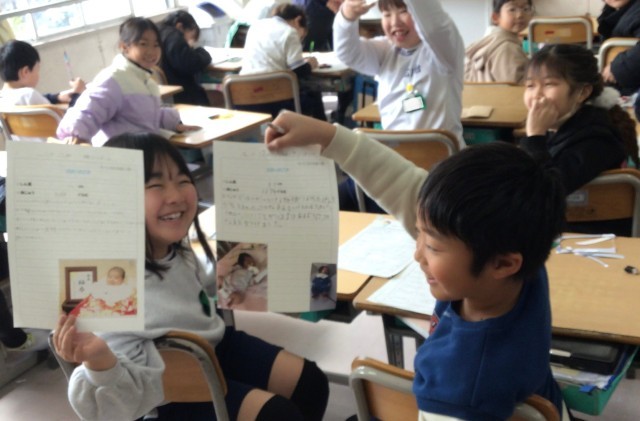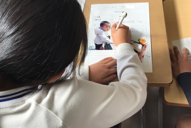 2年2組さん、生活科の授業で赤ちゃんだったころの様子を写真付きでまとめていました。