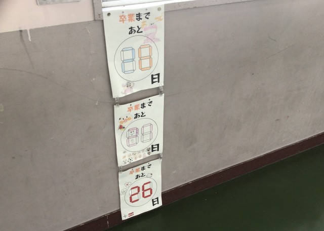 6年生の廊下には「(残りの日数を数える)カレンダー」が掲示されていました。