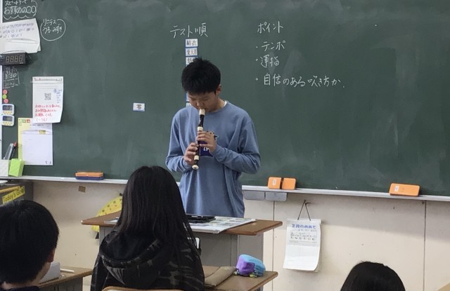 5年2組さん、リコーダーのテストを一人ずつ教室で行っていました。