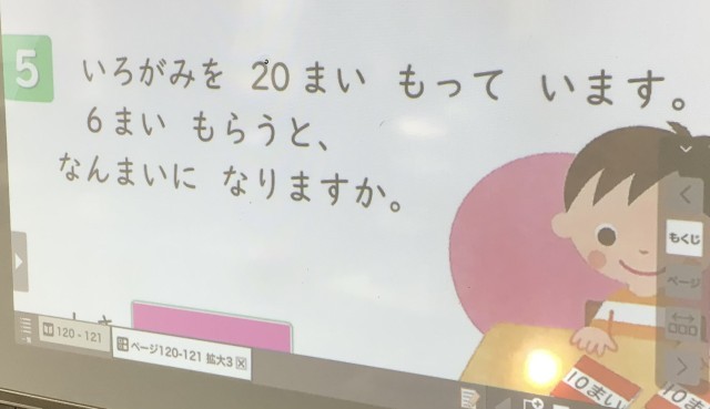 今日は「いろがみを20枚もっているところに、さらに6枚もらうと何枚になるか?」を考えていました。