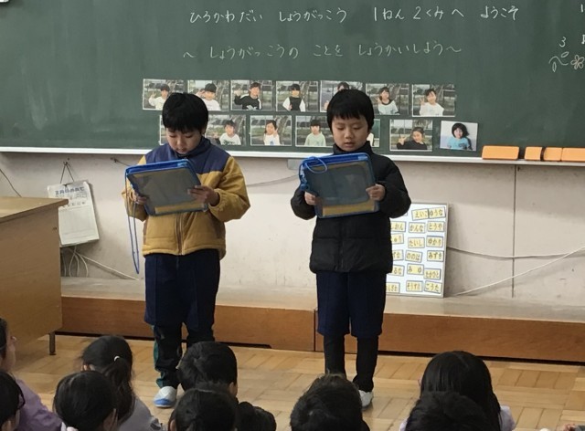 1年2組さん、この後、東海こども園の年長さんが学校に来てくれるので、小学校を説明する原稿を読む練習をしていました。