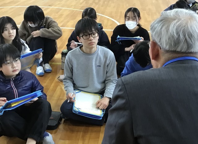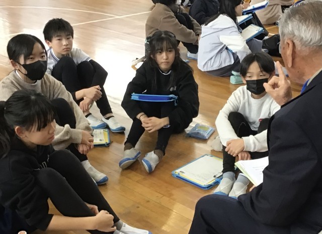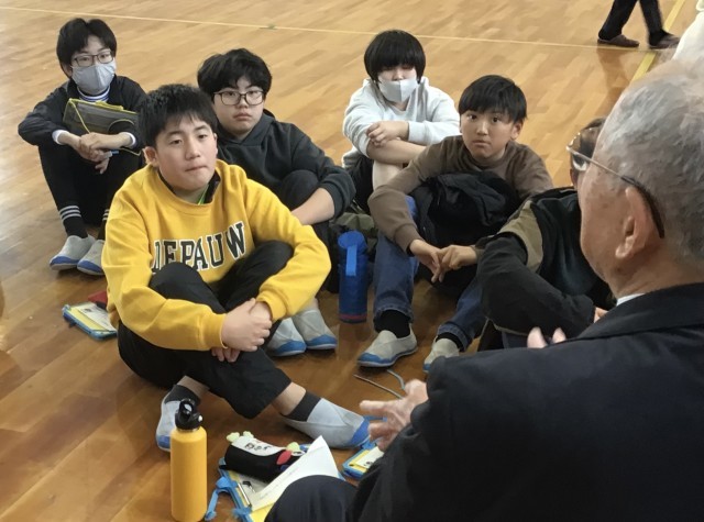 5時間目、6年生のみんなが「戦争体験を聴く会」ということで、体育館でお話を聴きました。