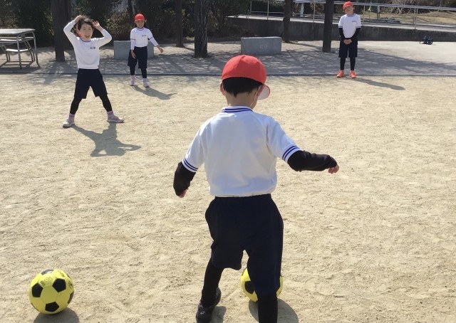 班で円を作って、2つのボールのパス練習をしていました。