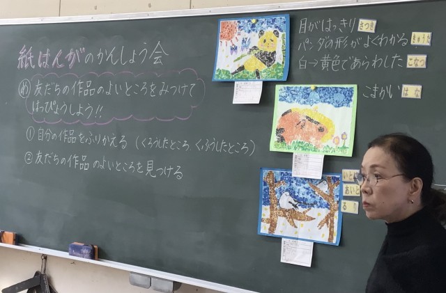 2年1組さん、3つの友達の作品に焦点をあてて、よいところを見つけて発表する場面でした。