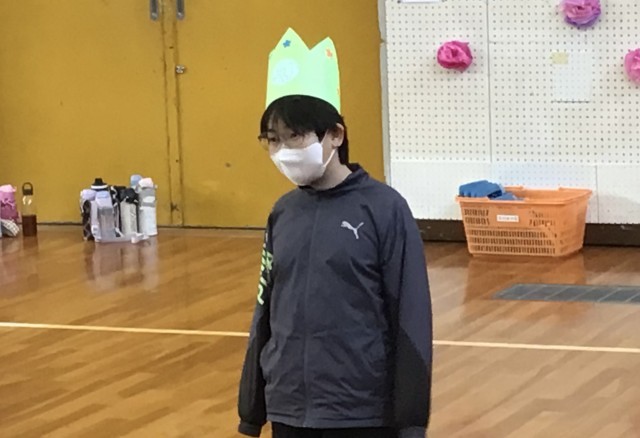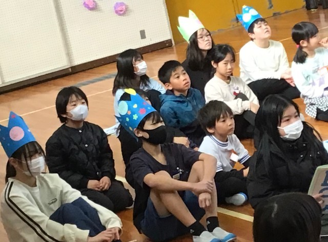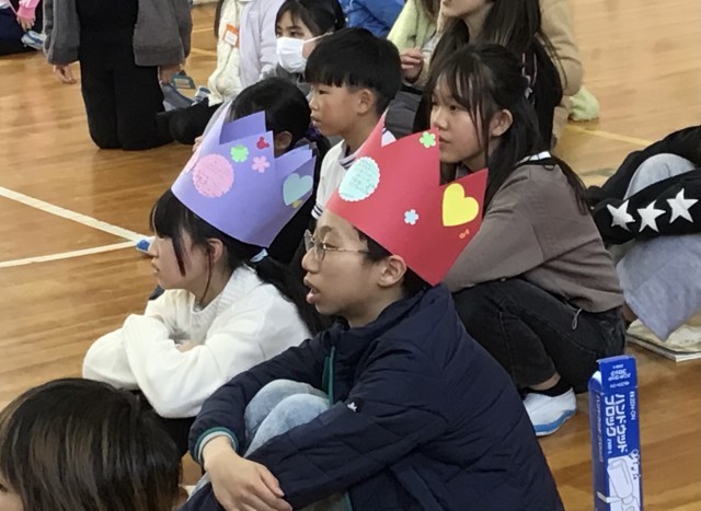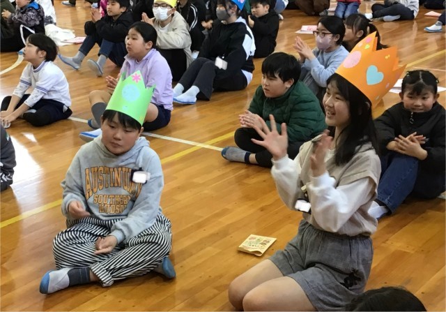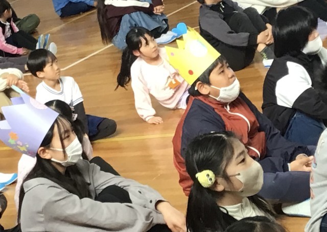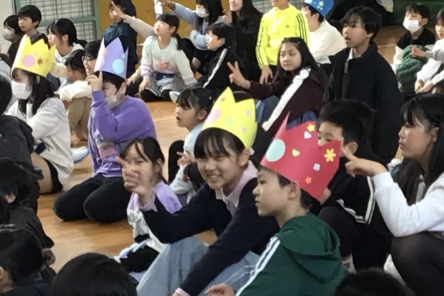 「王冠を作ってくれた1年生はその場に立ってください」5年生から紹介があり、みんなで「ありがとう」の意味をこめて拍手を送りました。