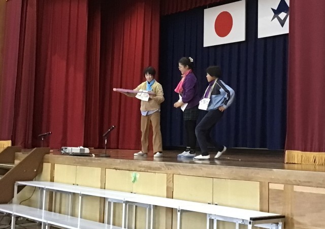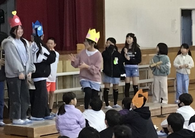 次の学年にうつる前も、5年生の子がショートコントをしてくれて、6年生と1年生の思い出「おいもパーティー」を振り返りました。