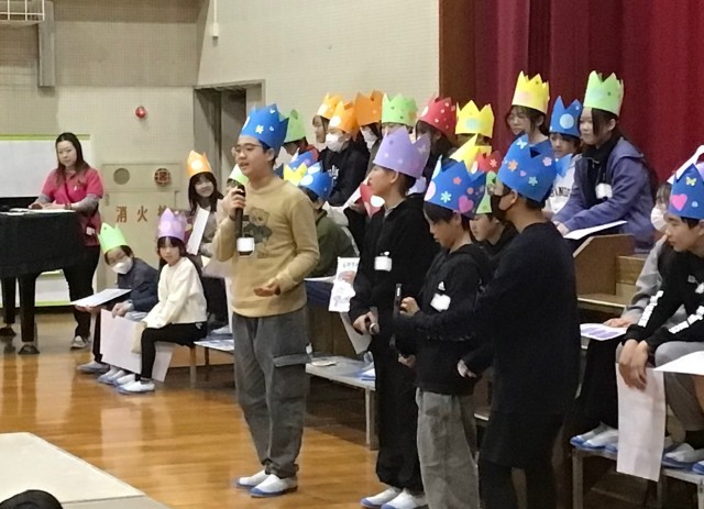「今から歌う曲は「マイバラード」という曲です。新しい世界に巣立っていく6年生。これから楽しいこと、つらいことなど、たくさんあると思いますが、仲間と共に乗り越えて欲しい。そんな思いが込められています。それでは聞いてください」
